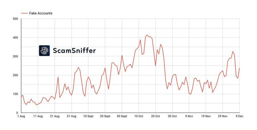 Les analystes de la société blockchain Scam Sniffer ont averti dans un article X du 10 décembre que depuis cette semaine, le nombre quotidien de comptes usurpés a augmenté de 87 %, passant à plus de 300, par rapport à la moyenne de 160 en novembre. les utilisateurs en tant que fraudeurs continuent d'opérer. utiliser des comptes de haut niveau pour promouvoir des stratagèmes frauduleux.