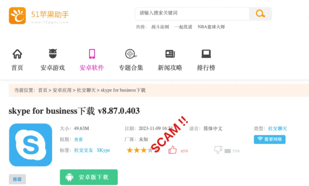 Selon SlowMist, une société de sécurité blockchain, un groupe d'escrocs chinois a récemment commencé à distribuer une fausse version de Skype (version 8.87.0.403) pour les appareils Android sur plusieurs marchés locaux, tels que 51pgzs, siyuetian et autres. Ils incitent les victimes à croire qu'elles ont téléchargé une version légitime de l'application de chat vidéo.
