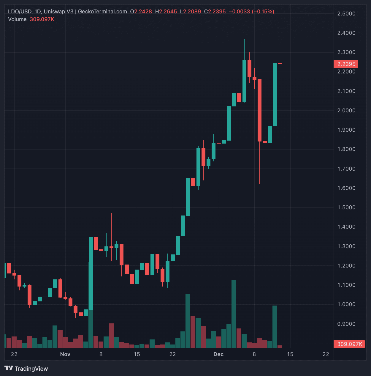 Au moment de la rédaction de cet article, le prix du jeton LDO est en hausse de plus de 16 % et s'échange à 2,23 $. Pendant ce temps, le prix de l'OP est en hausse de 6,4 % et se négocie à 2,50 $.