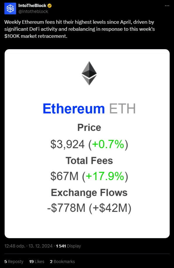 Malgré des frais de gaz élevés, le prix d'ETH n'a augmenté que de 0,7 %, signalant un sentiment de marché prudent. Au moment de la rédaction, l'ETH se négociait à 3 919,47 $, reflétant une baisse de 1,42 %. Cependant, on s'attend à ce qu'Ethereum retrouve de l'élan et franchisse le niveau de 4 000 $, à l'image de la reprise du Bitcoin.
