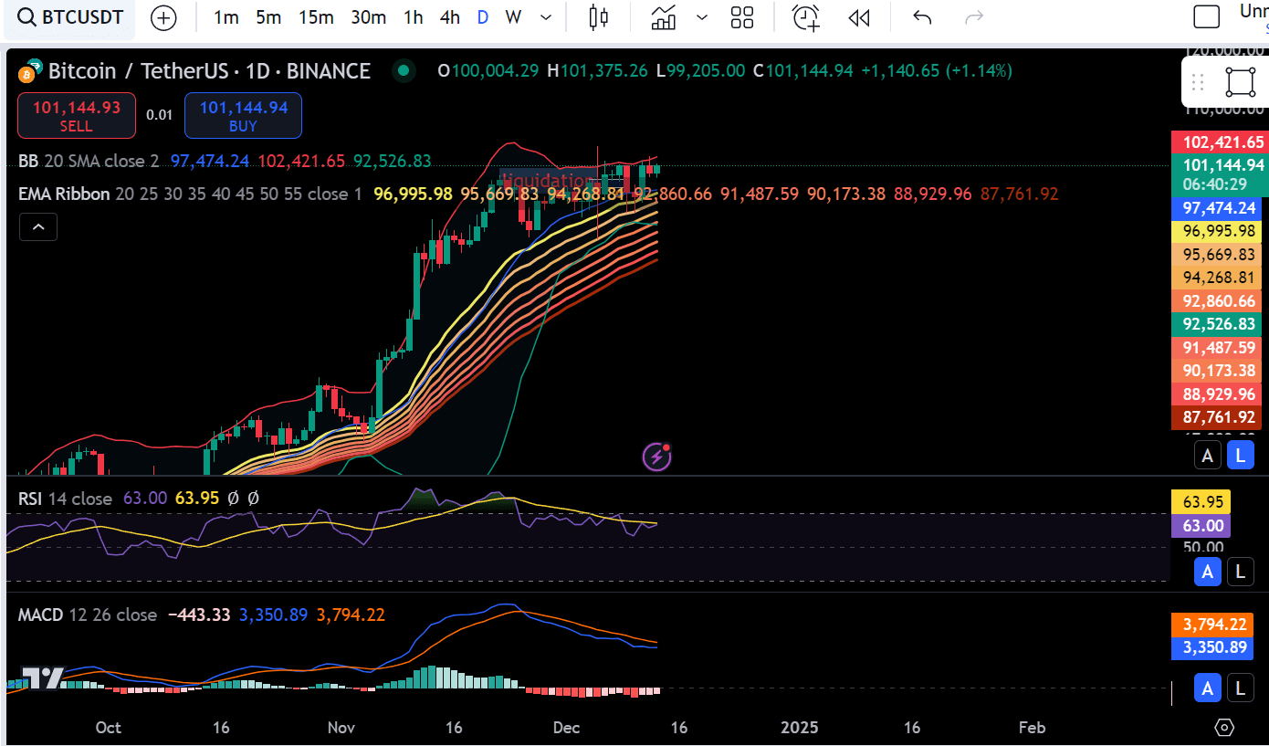 Ici, nous pouvons voir que le BTC est haussier. Il maintient les bandes de Bollinger et le ruban EMA.