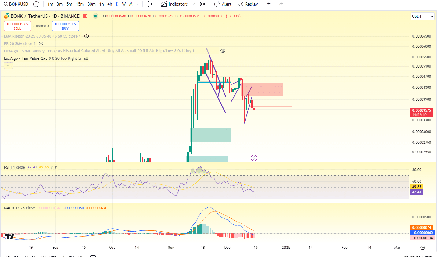 Nous pouvons voir que Bonk est baissier. Les rapports MACD et RSI indiquent une tendance baissière. Il a