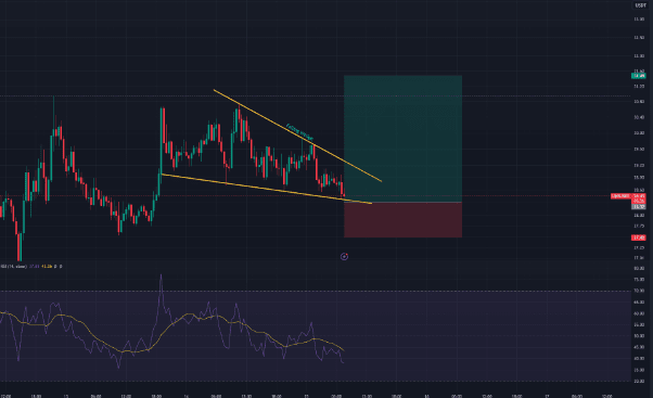 Le graphique LINK/USDT montre un motif de coin descendant, qui est un signal de retournement haussier. Le prix est proche de la ligne de tendance inférieure, suggérant une possible rupture à la hausse. Le RSI à 37,81 indique des conditions de survente, rendant un rebond haussier probable. Si la rupture se produit, le prix pourrait atteindre 31,40 $, avec un fort intérêt d'achat près de 27,48 $ agissant comme support.