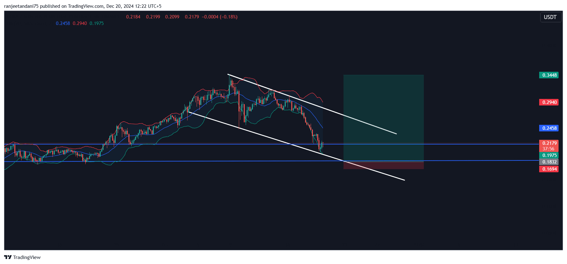 Scénario baissier : l'incapacité à maintenir la zone de support de 0,185-0,21 pourrait entraîner un retracement plus profond des prix. Si le prix tombe en dessous de cette zone, cela pourrait signaler une tendance baissière et d'autres objectifs de baisse pourraient être envisagés.