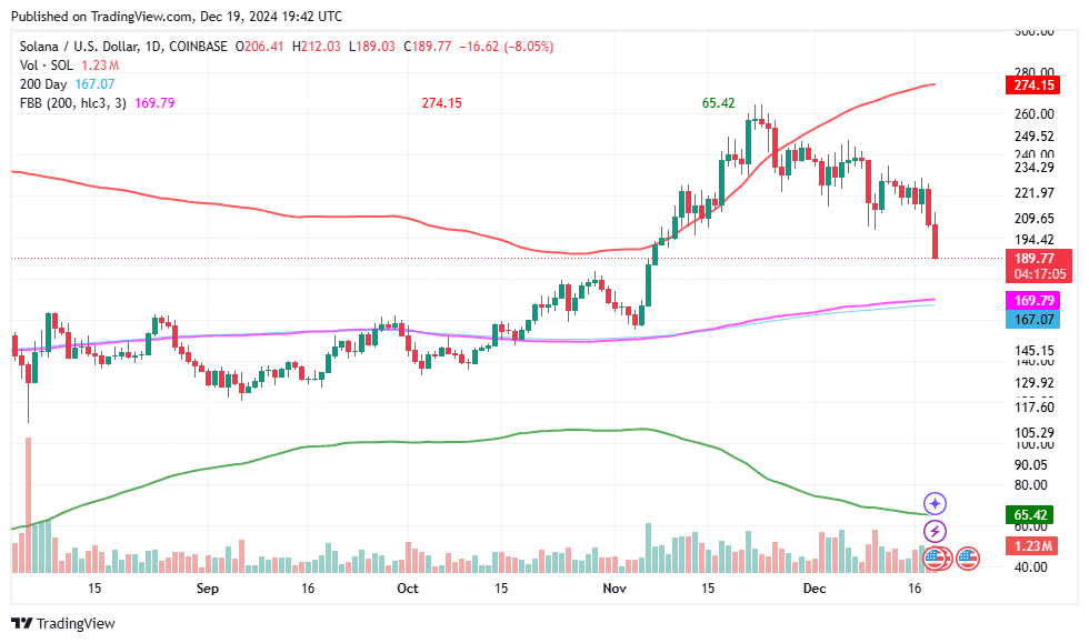 Les analystes ont identifié un niveau de support clé pour Solana à 166,86 $, tandis que le principal niveau de résistance se situe autour de 218,05 $. La moyenne mobile simple (SMA) sur 200 jours devrait bientôt baisser, ce qui pourrait avoir un impact sur la trajectoire des prix.