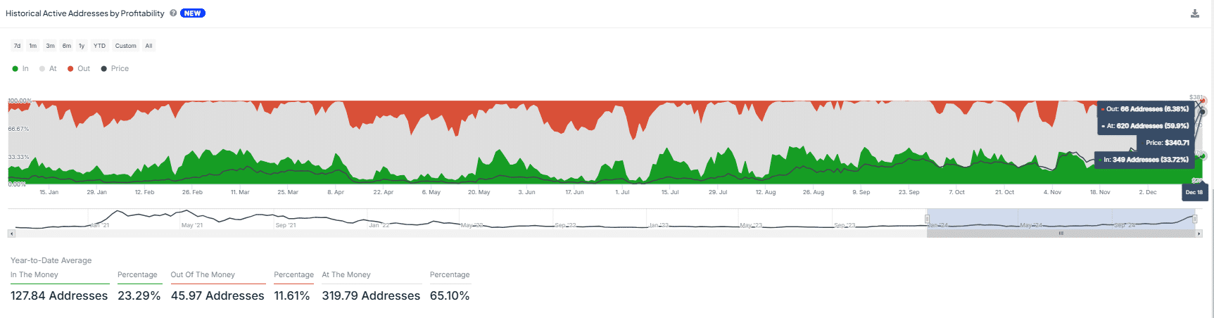 La rentabilité moyenne des adresses révèle que 23,29 % des investisseurs sont « dans le positif », nettement plus élevé que 11,61 % « hors du positif ». De plus, une augmentation de 10 % des adresses rentables, atteignant 33,72 %, signale un fort soutien autour du niveau de prix actuel de 340,71 $.