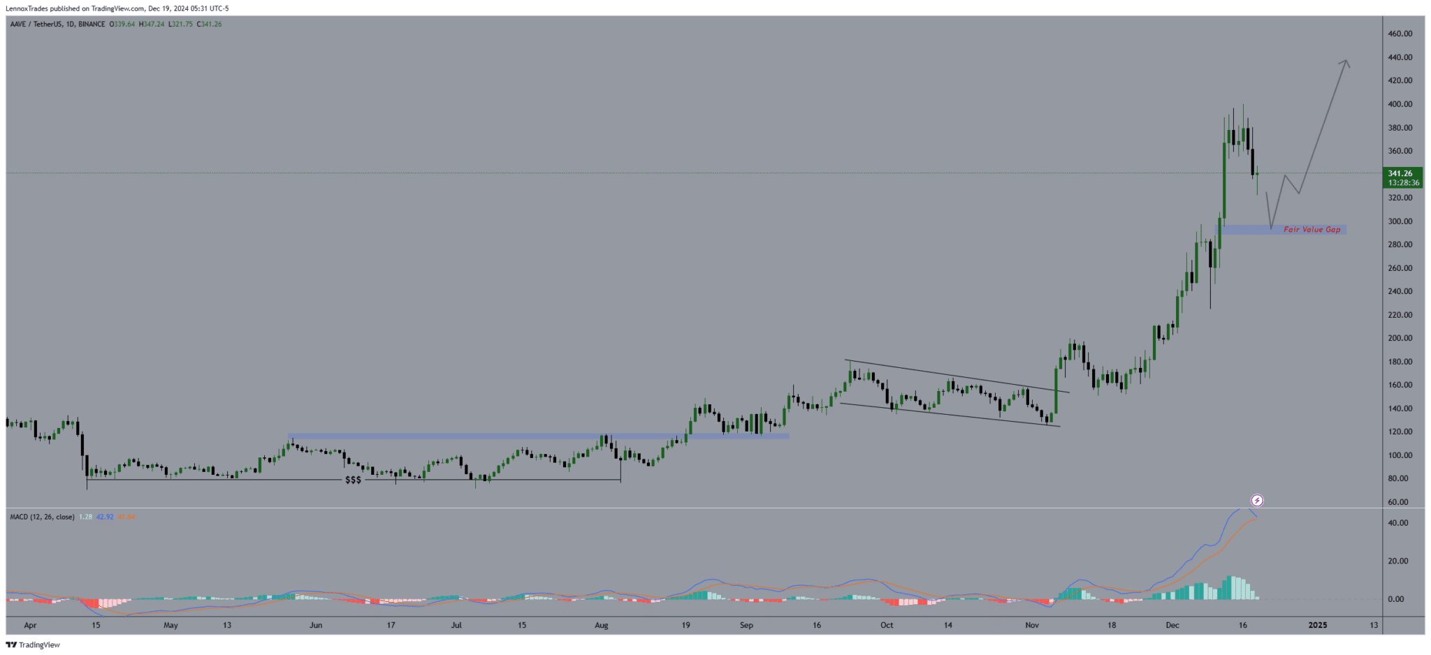 Le prix actuel de l'AAVE oscille au-dessus d'un niveau de support significatif autour de 300 $, connu sous le nom de Fair Value Gap (FVG). Ce niveau est considéré comme un point de retournement crucial qui pourrait alimenter une nouvelle croissance des prix.