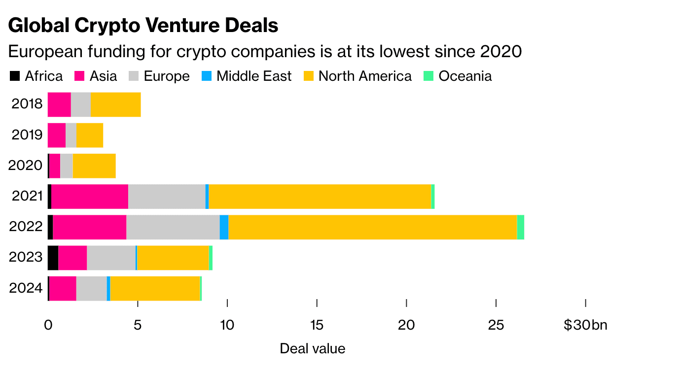 Essentiellement, Tether est une stablecoin très utile pour les entreprises crypto dans l'UE et une source importante de liquidité. Malgré le niveau élevé de développement et d'intérêt dans la région, certains produits financiers européens sont éclipsés par le marché centré sur les États-Unis. Dans l'ensemble, les investissements en crypto dans l'UE ont diminué en 2024 par rapport à d'autres marchés régionaux, et MiCA pourrait entraîner une baisse supplémentaire.