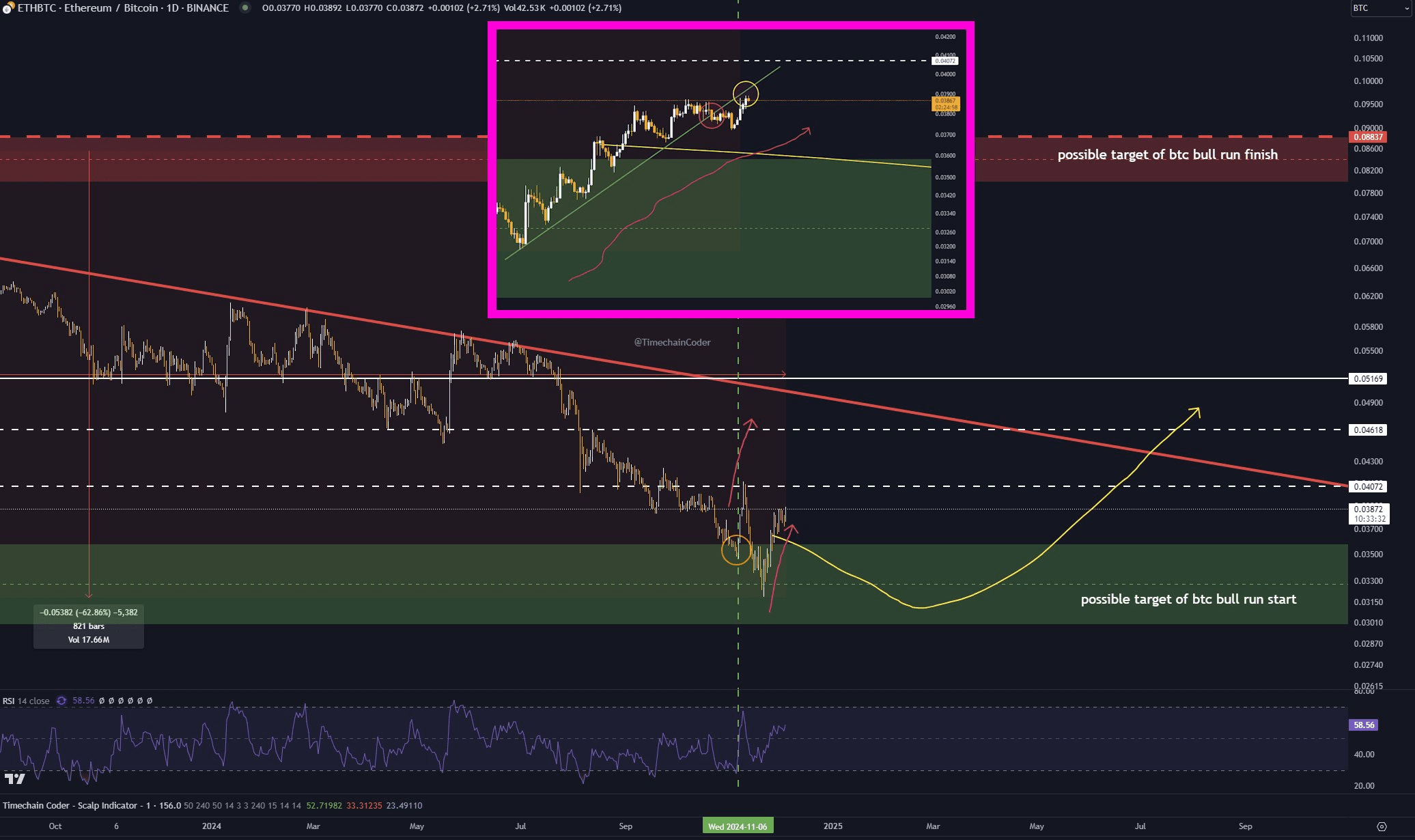 Pour des raisons similaires, plus le BTCDOM et le BTC augmentent ensemble avant que ce processus ne commence, mieux c'est pour vous et plus grandes seront les méga hausses espérées dans les altcoins. Je ne veux pas entrer dans trop de détails à ce sujet en ce moment.