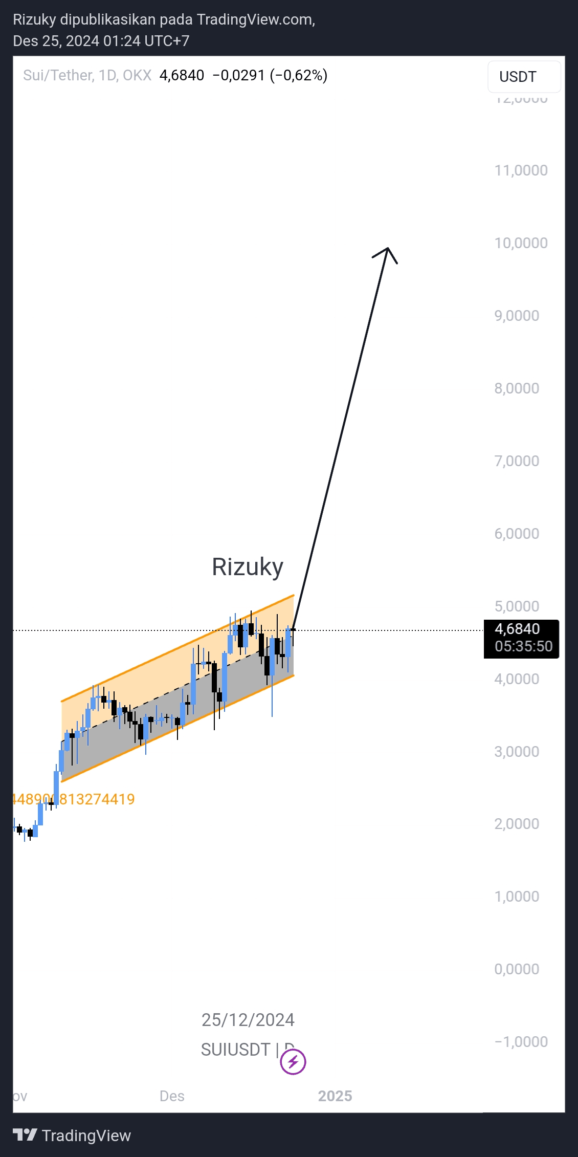 Sur le graphique 1D $SUI /USDT, vous pouvez voir que le prix évolue dans un canal ascendant marqué par la zone jaune. Le prix se situe actuellement autour du niveau de 4,68 $, indiquant une consolidation dans la zone de résistance du canal supérieur.