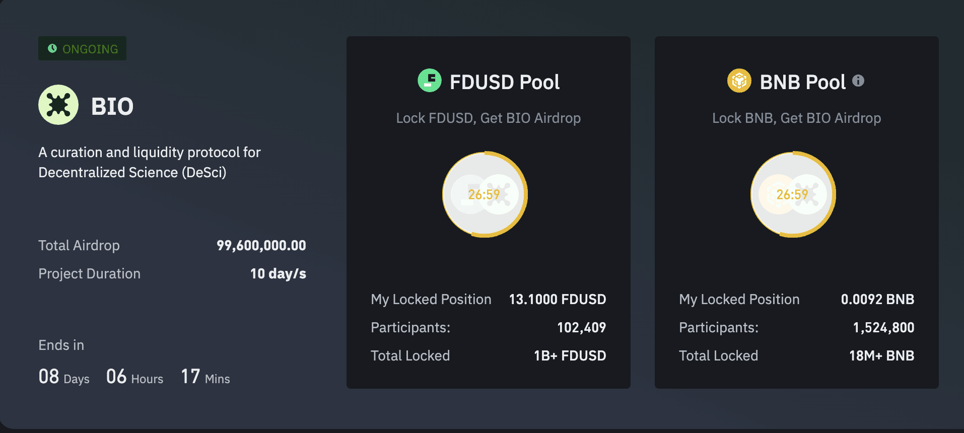 Les utilisateurs peuvent verrouiller des jetons BNB et FDUSD pour cultiver $BIO pendant une période de 10 jours.