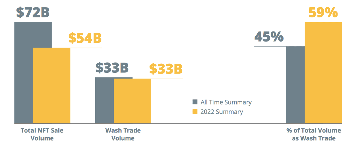 Plus tôt en 2023, un rapport conjoint du fournisseur d'analyses NFT bitsCrunch et Cointelegraph Research, intitulé « BitsCrunch NFT Wash Trade Report for 2022 », a montré que l'activité de trading de lavage NFT avait augmenté de 25 fois en 2022 pour atteindre environ 33 milliards de dollars. Cela signifie que plus de la moitié du total de 54 milliards de dollars de NFT négociés sur la blockchain Ethereum en 2022 était liée au wash trading.
