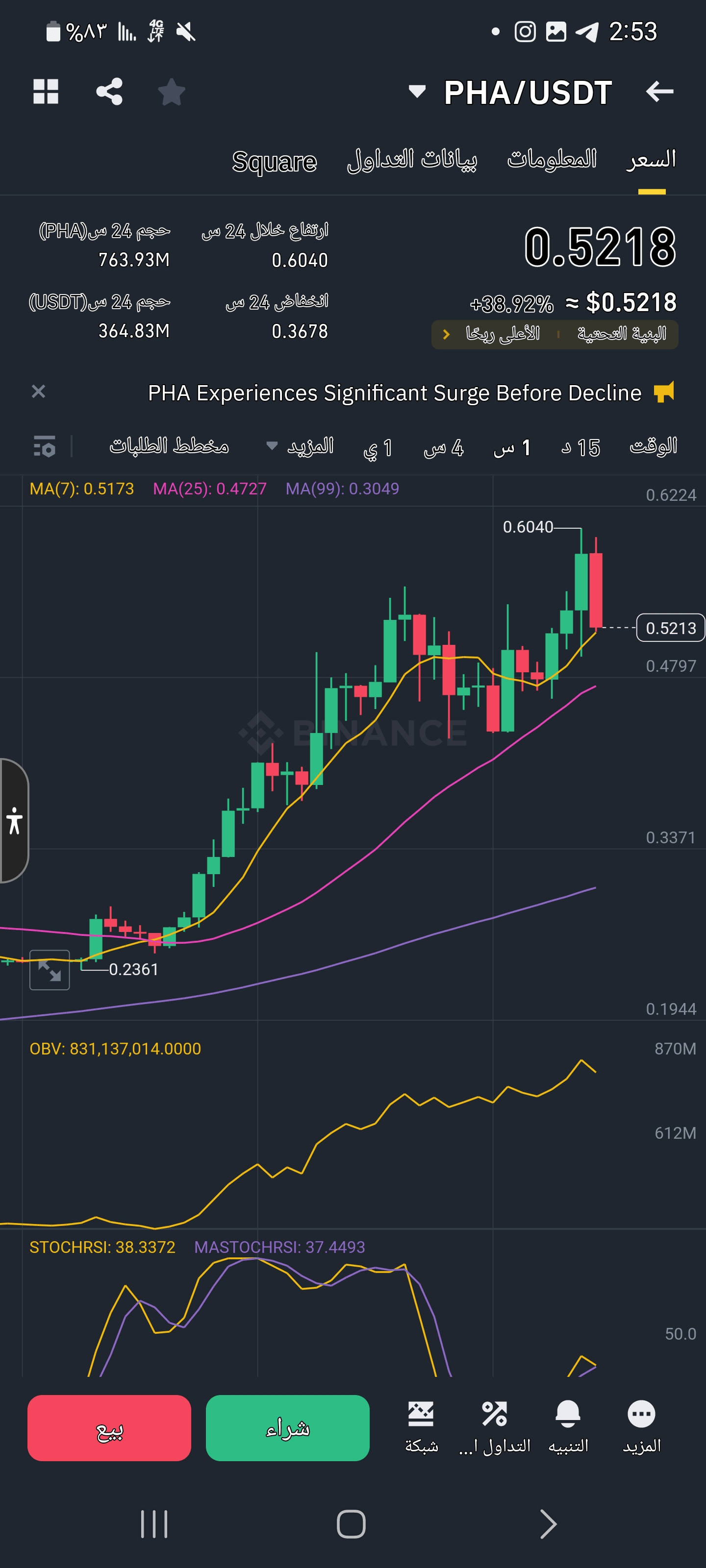 $PHA /USDT a explosé avec une dynamique haussière et se négocie actuellement à 0,5419 $ après un énorme rallye. Le RSI indique des conditions de surachat à 89, reflétant un fort intérêt d'achat. Le plus haut sur 24 heures de 0,6040 $ représente la prochaine résistance, tandis que 0,5200 $ constitue un support essentiel pour surveiller d'éventuelles corrections.