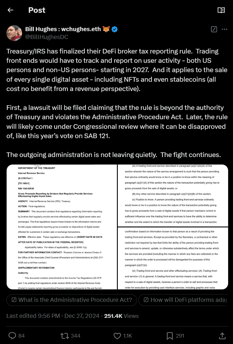 Le 9 juillet 2024, le département du Trésor des États-Unis a publié des règlements finaux exigeant que les courtiers dépositaires rapportent des informations sur les transactions pour les actifs qu'ils gèrent au nom de leurs clients. De plus, ils ont averti que des règlements similaires seraient appliqués aux courtiers non dépositaires à l'avenir.