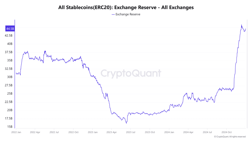 Les réserves de stablecoins sur Binance atteignent un niveau record de 45,8 milliards de dollars, selon CryptoQuant. 💵 C'est énorme car les stablecoins sont la principale porte d'entrée pour les investisseurs qui passent de la monnaie fiduciaire à la crypto.