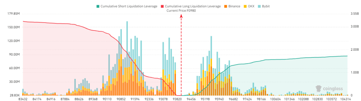 Franchir les 96 400 $ pourrait déclencher un short squeeze de 1,24 milliard de dollars, liquidant les positions courtes à effet de levier et faisant flamber le BTC. 📉➡️📈