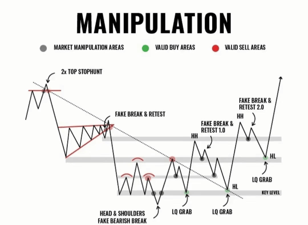 La manipulation du marché se produit lorsque de grands acteurs (par exemple, des institutions ou des "smart money") créent de faux signaux pour induire en erreur les traders de détail. Cela implique souvent des faux breakouts, des chasses de stop et des saisies de liquidité.