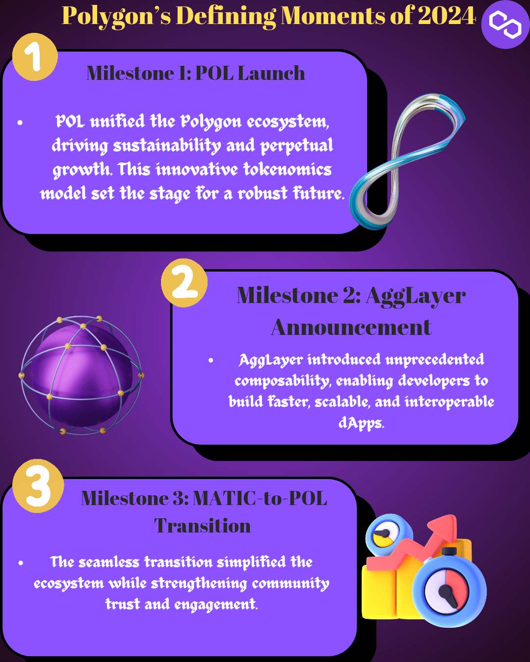 Un autre jalon à noter a été la transition fluide de MATIC à POL, qui a non seulement simplifié l'écosystème token, mais a également montré le soutien de la communauté à la vision de Polygon.