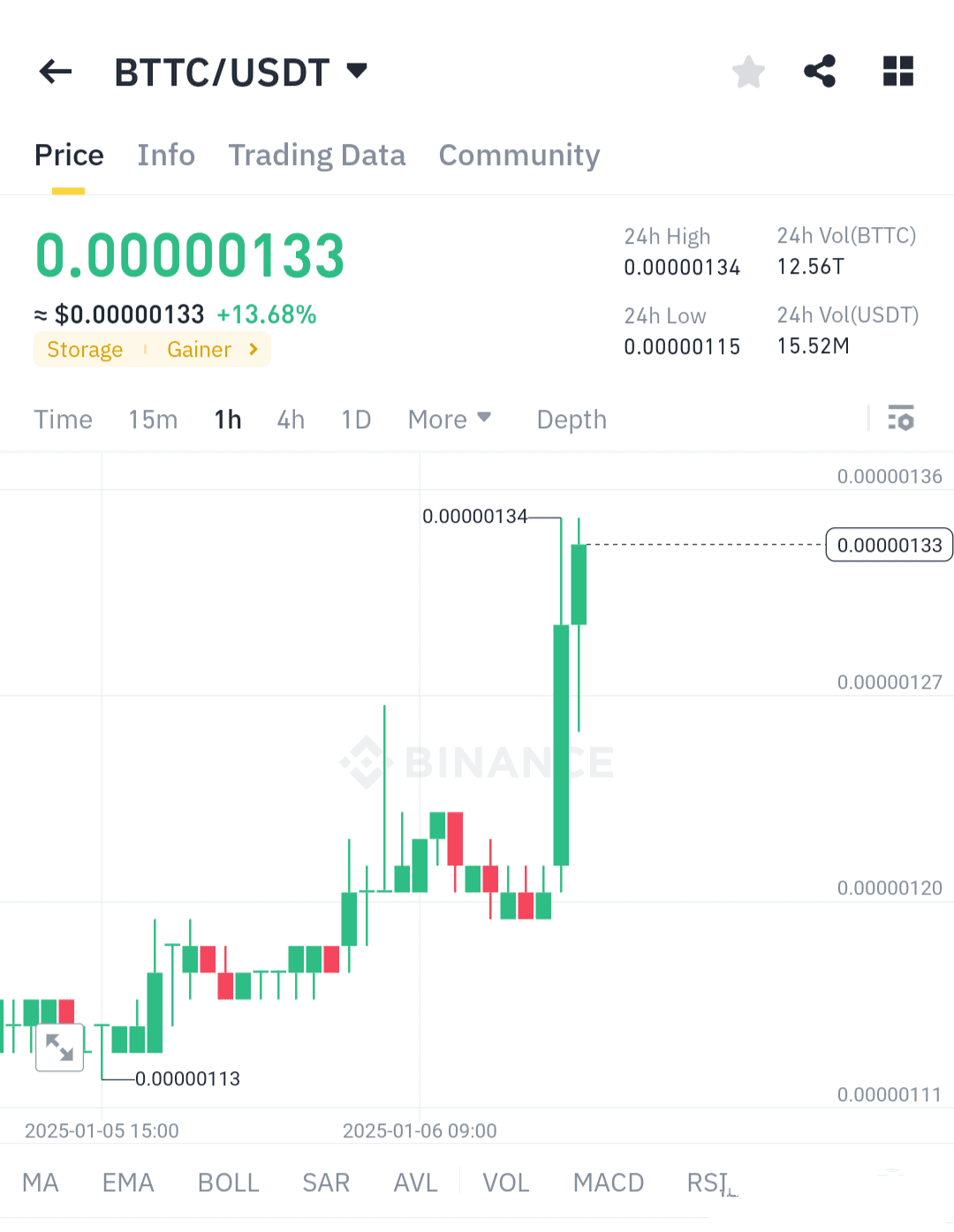 Cours actuel : $BTTC a augmenté de 13,68 %, passant de 0,00000115 $ à un sommet de 24 heures de 0,00000134 $. Cela indique une forte dynamique haussière.