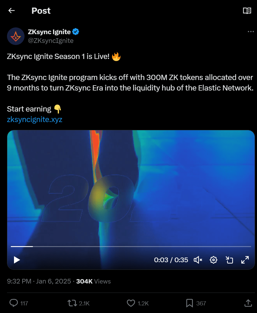 Le programme "Ignite" est conçu pour attirer les utilisateurs et augmenter la liquidité sur ZKsync Era, un réseau de couche 2 qui utilise la technologie ZK-rollup pour faire évoluer Ethereum. Ignite sera composé de plusieurs saisons, chacune durant plusieurs mois avec des récompenses en jetons ZK disponibles pour les utilisateurs qui participent à la fourniture de liquidité.