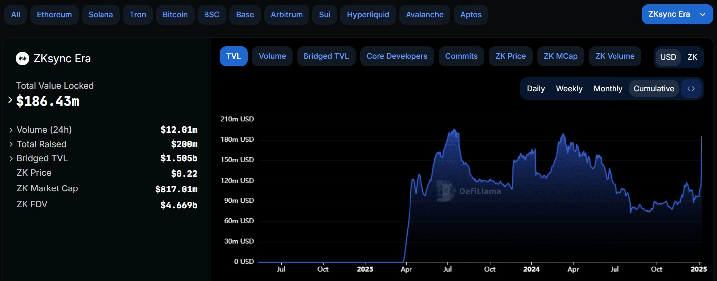 Le réseau ZKsync de couche 2 montre des signes de reprise après le creux post-airdrop. La valeur des actifs verrouillés (TVL) sur la plateforme a explosé de près de 90 %, passant de 97 millions de dollars à 184 millions de dollars en seulement la première semaine de janvier 2025.