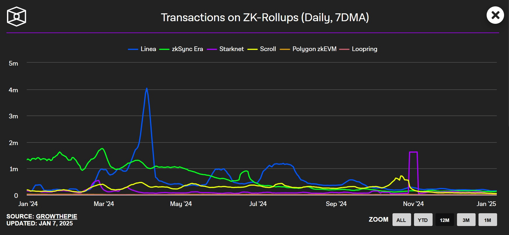 Plus précisément, la moyenne mobile sur 7 jours du nombre d'adresses actives a chuté de plus de 200 000 en juillet 2024 à seulement 30 000 à la fin décembre 2024. Cette tendance se manifeste également sur d'autres chaînes ZK-rollup telles que Linea, Scroll et Starknet.