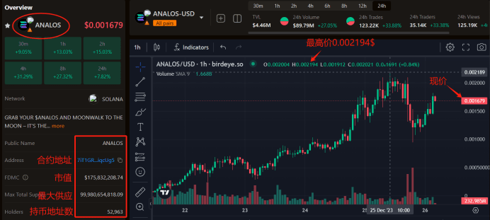 Depuis le lancement du jeton le 20 décembre, la valeur marchande d'ANALOS a dépassé 200 millions de dollars, contre 40 000 dollars, soit une augmentation de plus de 4 000 fois en seulement 7 jours. Selon les données de birdeye (site officiel : https://birdeye.so/), à minuit le 26 décembre 2023, le prix d'ANALOS est de 0,001679 $.