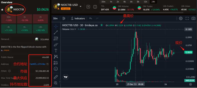 À minuit le 2023-12-26, le prix du NIOCTIB sur birdeye est de 0,0626 $.