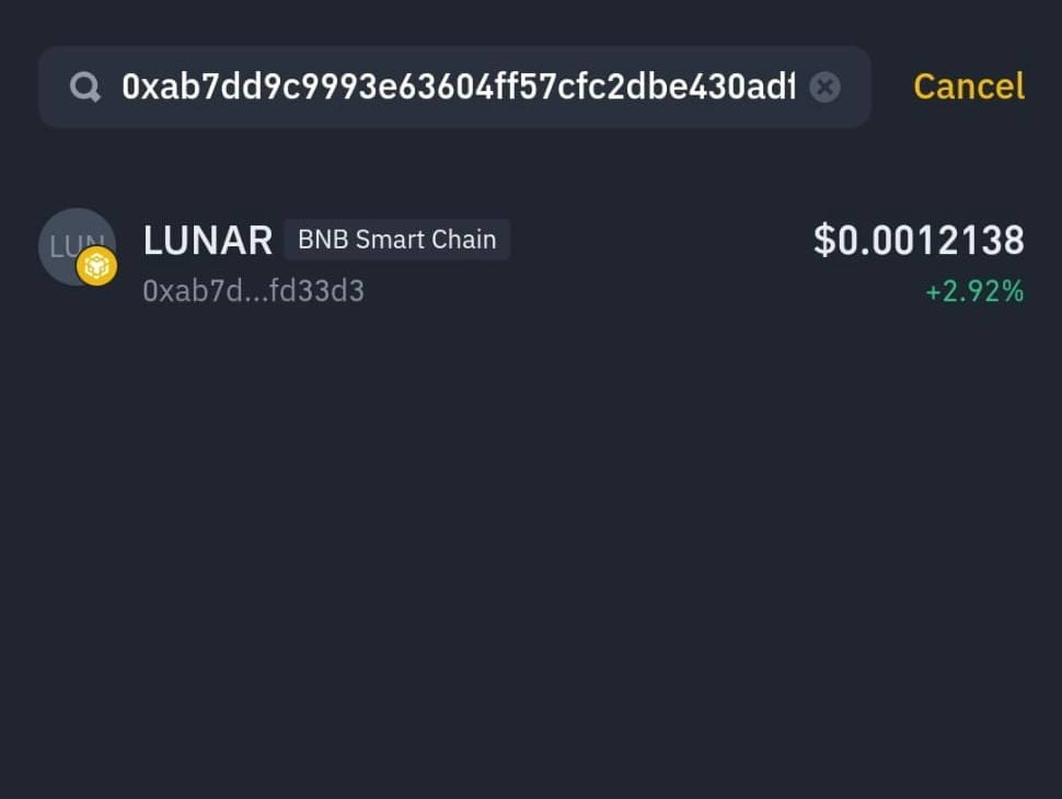 3️⃣ Collez l'adresse du contrat pour $LUNAR, puis confirmez pour l'ajouter.