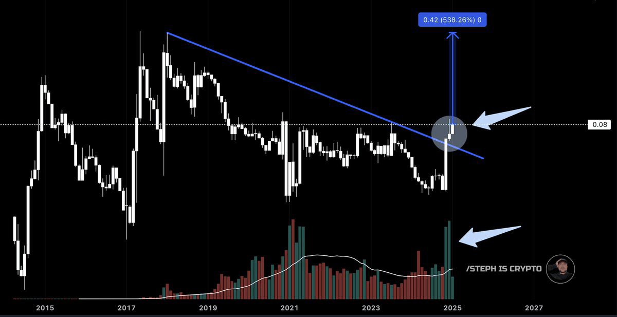 Depuis 2017, la paire XRP/BTC était bloquée sous une ligne de tendance descendante à long terme. Mais fin 2024, le XRP a brisé cette résistance avec une clôture hebdomadaire au-dessus de 0,000015 $BTC .