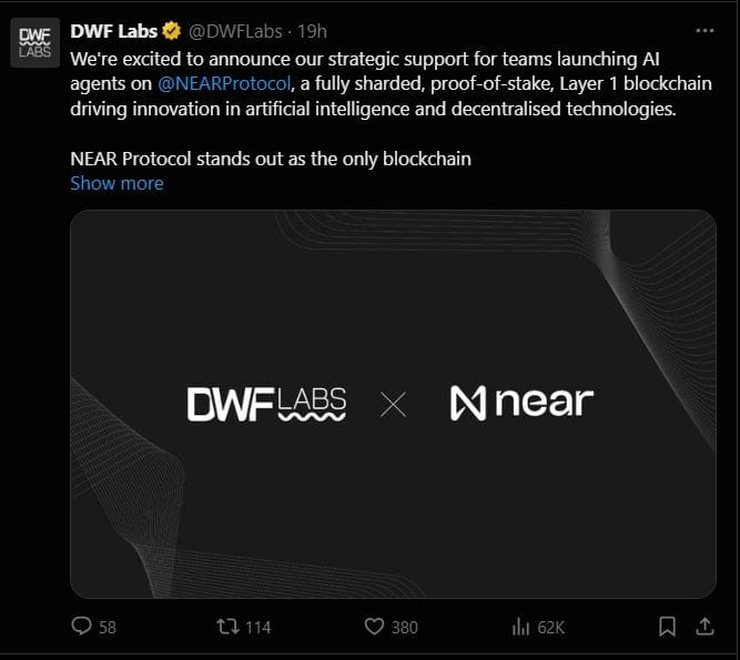 DWF Labs a annoncé un partenariat stratégique avec NEAR Protocol pour accélérer l'innovation dans le domaine de l'intelligence artificielle (IA) sur la plateforme blockchain. L’un des points forts de cette coopération est la création d’un fonds pour les agents d’IA de 20 millions de dollars, axé sur le soutien à des projets d’IA autonomes intégrant des cryptomonnaies.