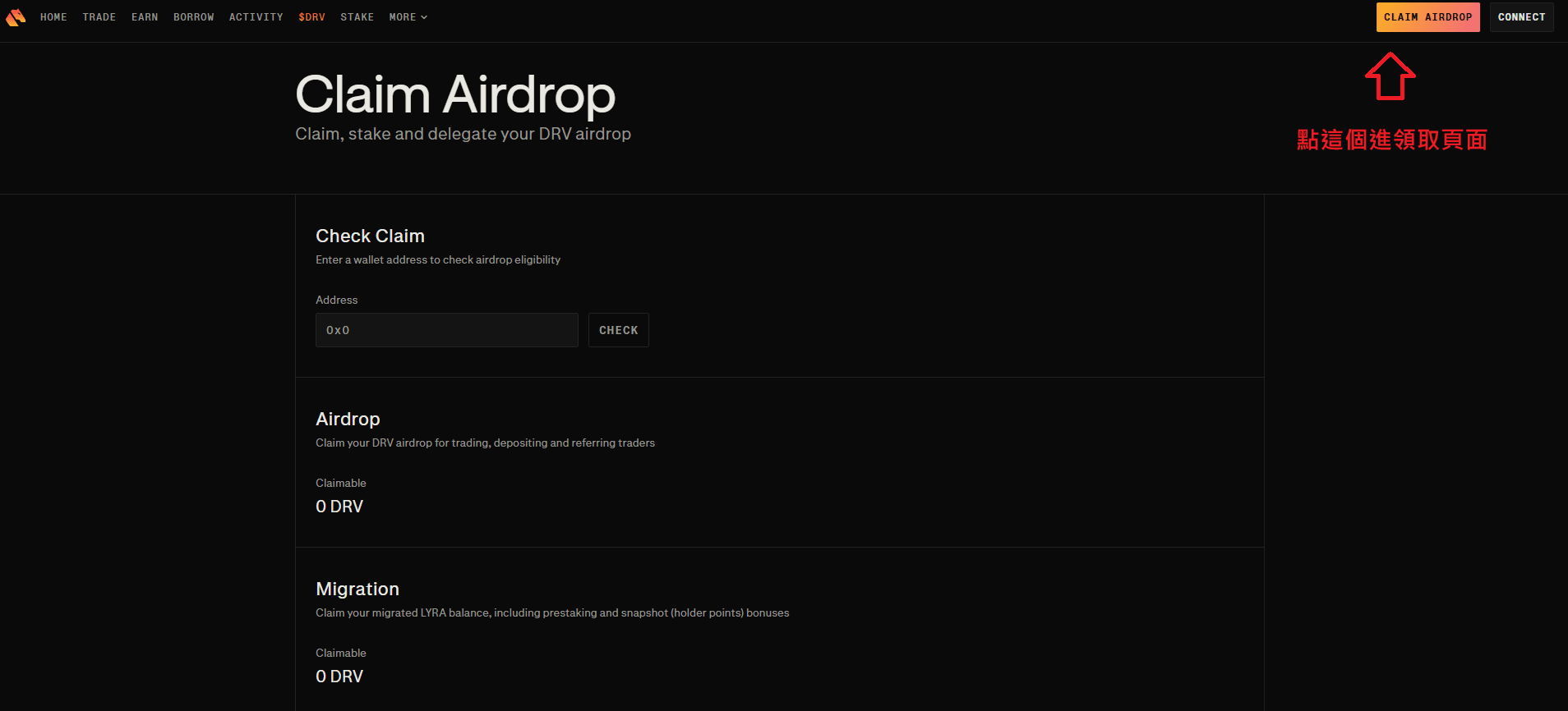 1. Après être entré sur le site officiel de Derive, cliquez sur "CLAIM AIRDROP" en haut à droite.