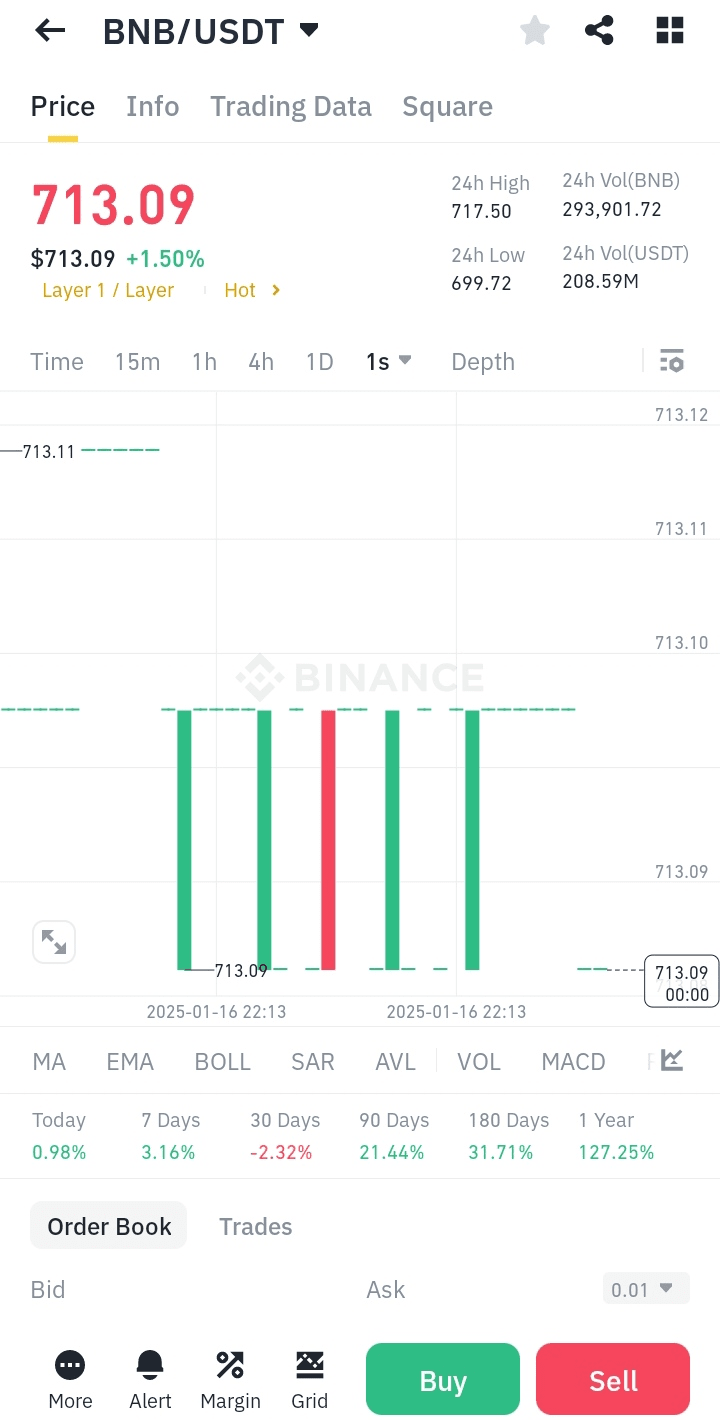 Le prix actuel de la paire BNB/USDT est de 713,09 $, ce qui reflète une augmentation de 1,50 % au cours de la dernière séance de négociation. La fourchette de prix de l'actif sur 24 heures a fluctué entre 699,72 $ (plus bas) et 717,50 $ (plus haut). Au cours de la même période, le volume de négociation de $BNB a atteint 293 901,72, tandis que l'USDT a enregistré un volume de 208,59 millions.