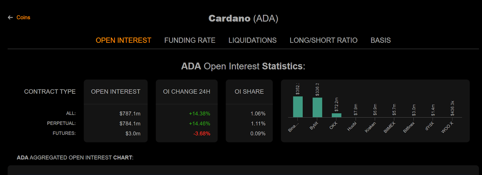 L'intérêt ouvert (OI) de Cardano a augmenté de 14,38 % en 24 heures pour atteindre 787,1 millions de dollars, reflétant une augmentation de l'activité des traders.
