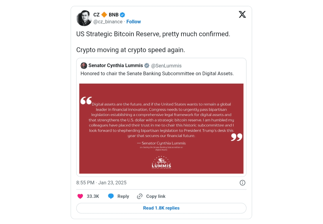 En voyant son post sur X (anciennement Twitter), l'ancien PDG de Binance CZ a commenté que « La réserve stratégique de Bitcoin des États-Unis, c'est pratiquement confirmé. » Il a ajouté que la crypto évolue à nouveau à la vitesse de la crypto.