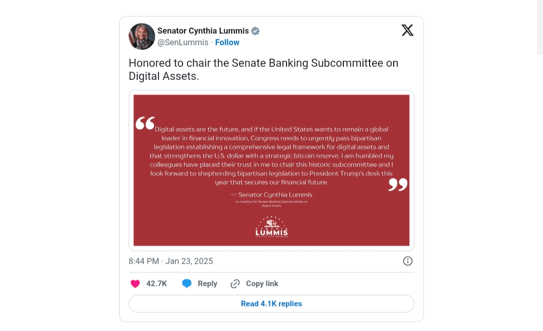 Dans un développement récent, la sénatrice pro-crypto Cynthia Lummis est devenue la présidente de la sous-commission bancaire du Sénat sur les actifs numériques, comme elle l'a elle-même confirmé sur X (anciennement Twitter). Lummis est connue pour être une fervente défenseure de la cryptomonnaie et de la technologie blockchain, souvent qualifiée de législatrice « amicale envers la crypto ».