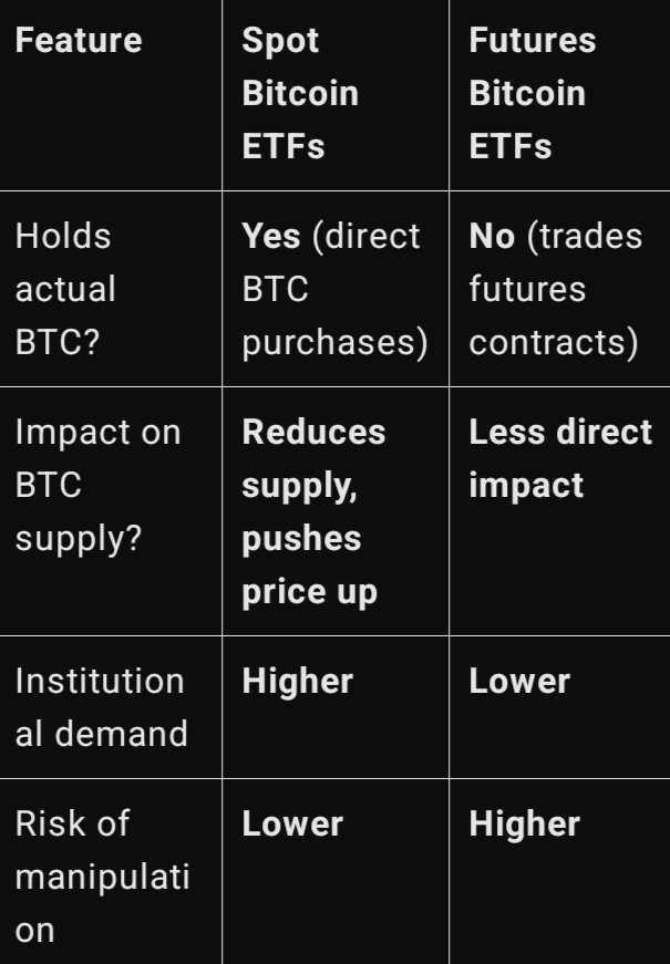 Les Spot ETFs détiennent du Bitcoin réel, affectant directement l'offre et le prix, tandis que les futures ETFs échangent des contrats, entraînant un impact moindre sur la valeur réelle du Bitcoin.
