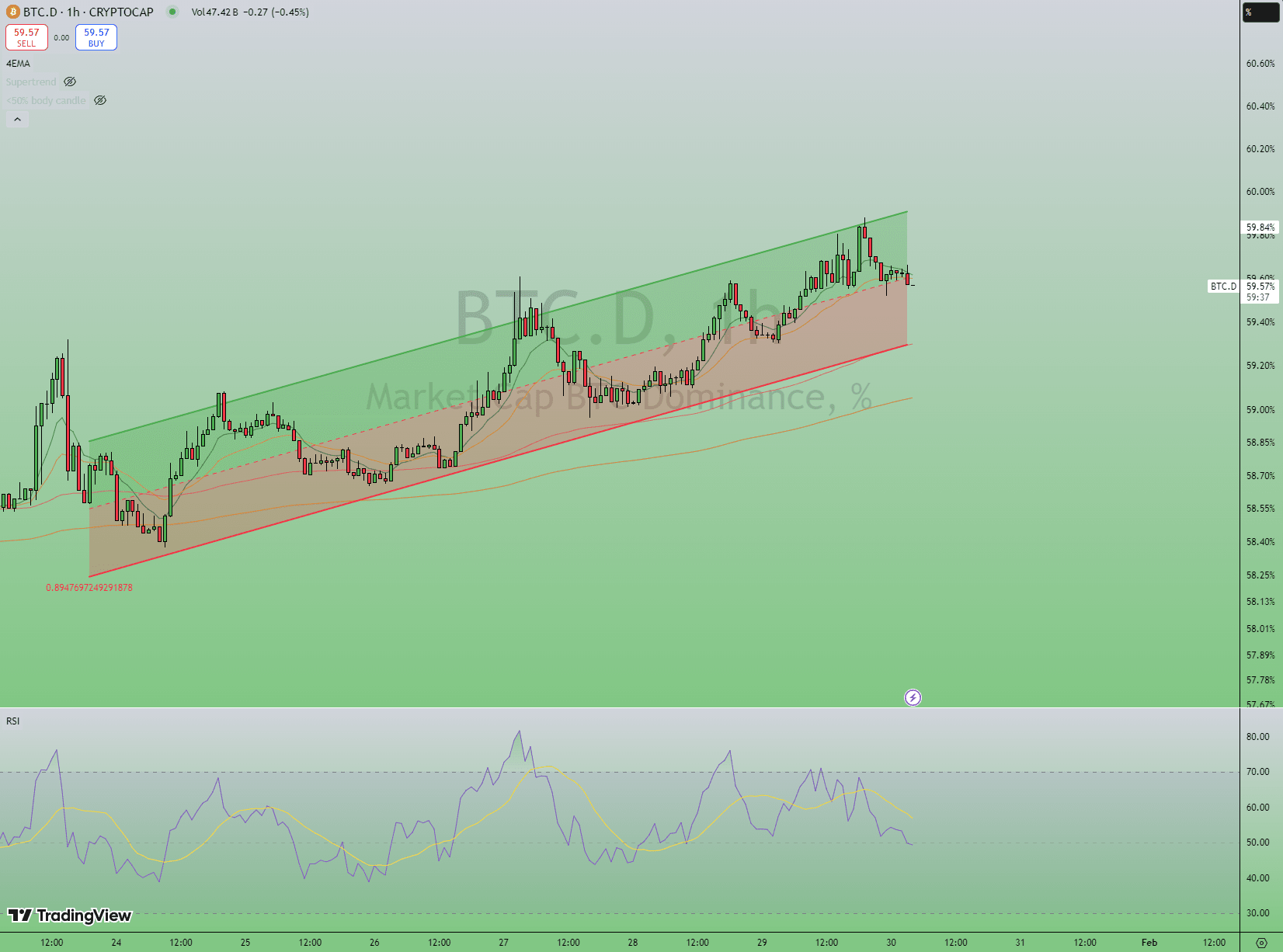 Sur le graphique horaire, la domination du BTC a formé un modèle de triangle baissier, indiquant un mouvement potentiel à la baisse. 📉 En plus de ce sentiment baissier, nous repérons également une divergence baissière, renforçant la confluence pour une éventuelle baisse.