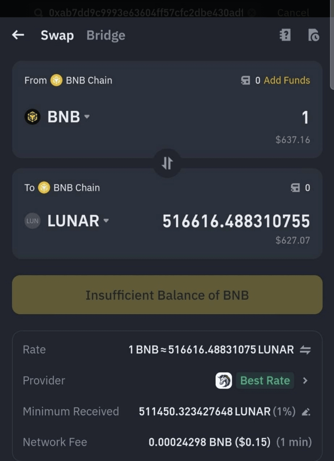 3️⃣ Entrez le montant de BNB que vous souhaitez échanger contre $LUNAR.