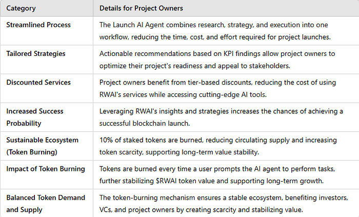 Les propriétaires de projets peuvent accéder à l'Agent IA de Lancement en mettant 50 000 000 $RWAI ou $RWA pendant un minimum de 60 jours. Cette phase automatise les étapes complexes impliquées dans le lancement de projets Web3 ou de RWAs tokenisés.