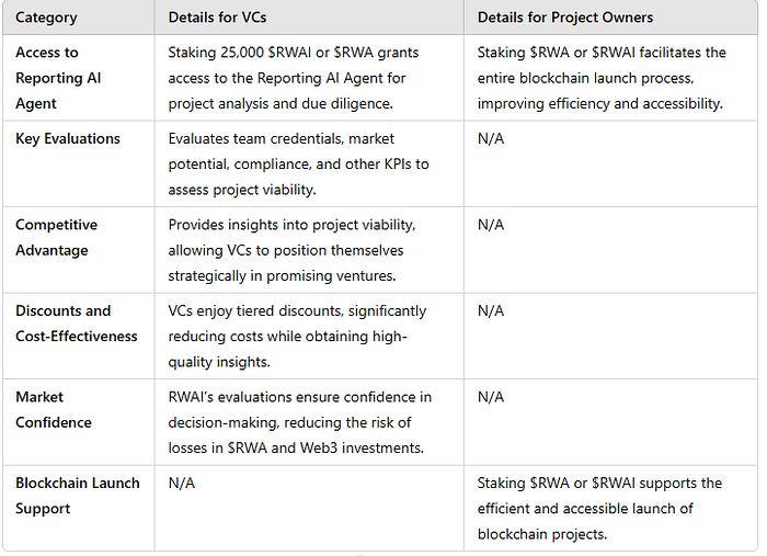 En mettant 25 000 $RWAI ou $RWA, les VCs accèdent à l'Agent IA de Reporting, offrant des analyses détaillées de projets et des rapports de diligence raisonnable. Cela inclut des évaluations des compétences de l'équipe, du potentiel du marché, de la conformité et d'autres KPI critiques.