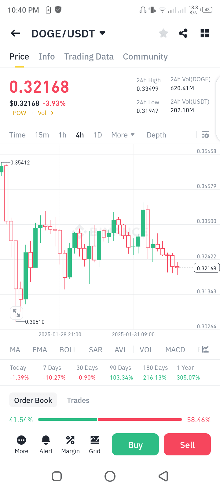 1. Mouvement des Prix : Le prix actuel de $DOGE /USDT est 0.32168, montrant une baisse de 3,93 %. Le prix a fluctué dans une plage, indiquant une consolidation potentielle.
