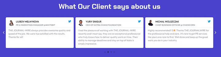 The Journal-Wire est une agence de RP et de marketing full-stack spécialisée dans les marchés de la blockchain, de la cryptomonnaie, du Web3 et de la FinTech. Notre mission est d'aider les entreprises à obtenir une exposition médiatique à fort impact en sécurisant une couverture médiatique de premier plan à des tarifs compétitifs. Nous proposons des solutions de RP sur mesure qui élèvent la visibilité de la marque, établissent la crédibilité et favorisent l'engagement dans un paysage numérique en constante évolution.