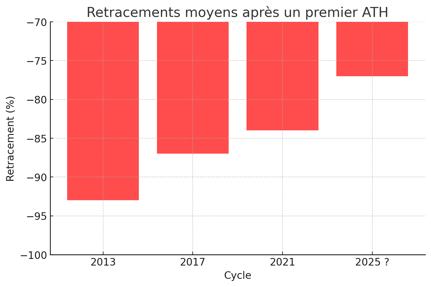 Les retracements intermédiaires observés après un premier ATH sont en moyenne de -40% à -54% avant une reprise haussière :