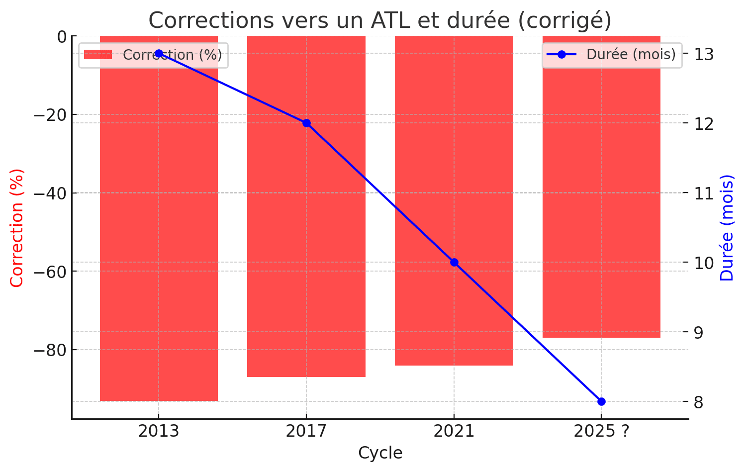 2025 ? → Si cette tendance se poursuit, l’ATL pourrait être atteint en seulement 8 mois après l’ATH de janvier 2025, soit vers août-septembre 2025.