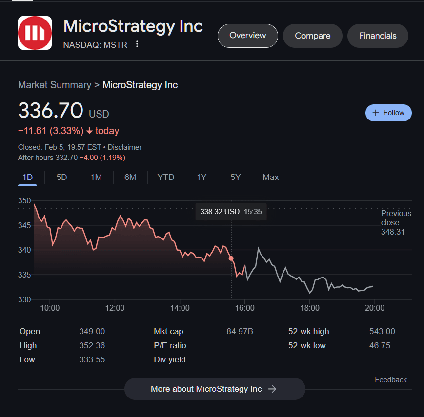 Actuellement, les actions de Strategy (MSTR) se négocient à 336,27 $ par action, en baisse de 3,3 % après la publication de la nouvelle.