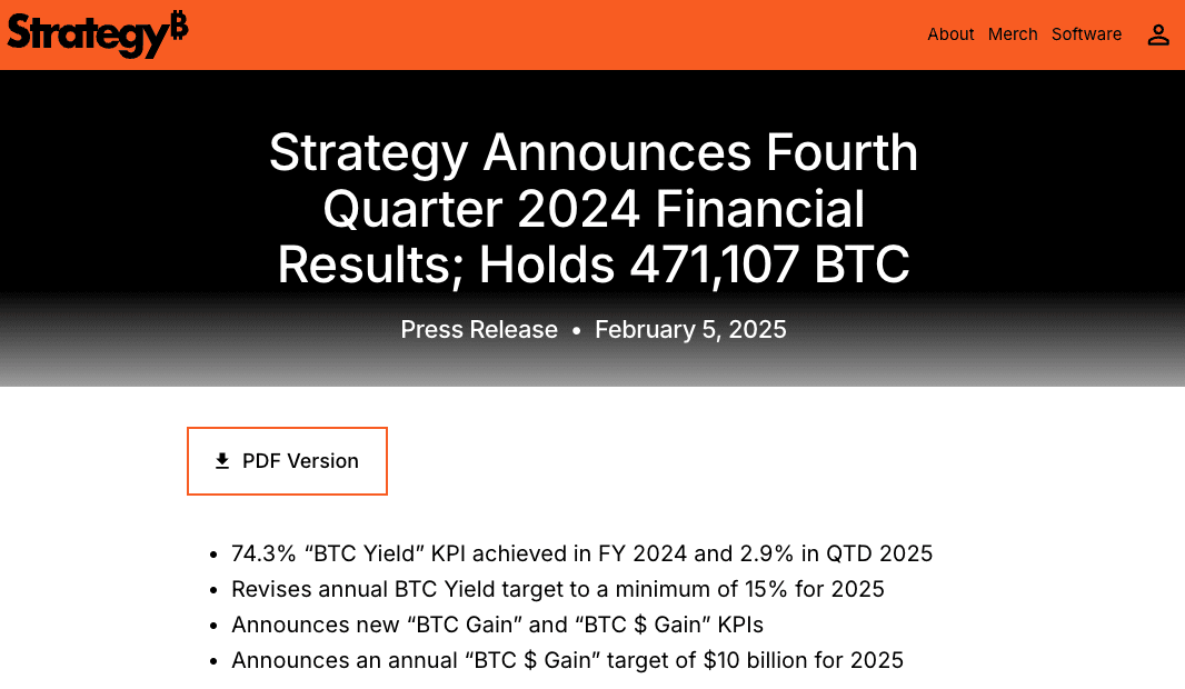 Peu après le changement de nom, Strategy a publié ses états financiers pour le T4/2024, montrant que l'entreprise a enregistré un rendement BTC de 74,3 % en 2024 et a révisé son objectif 2025 à plus de 15 %.