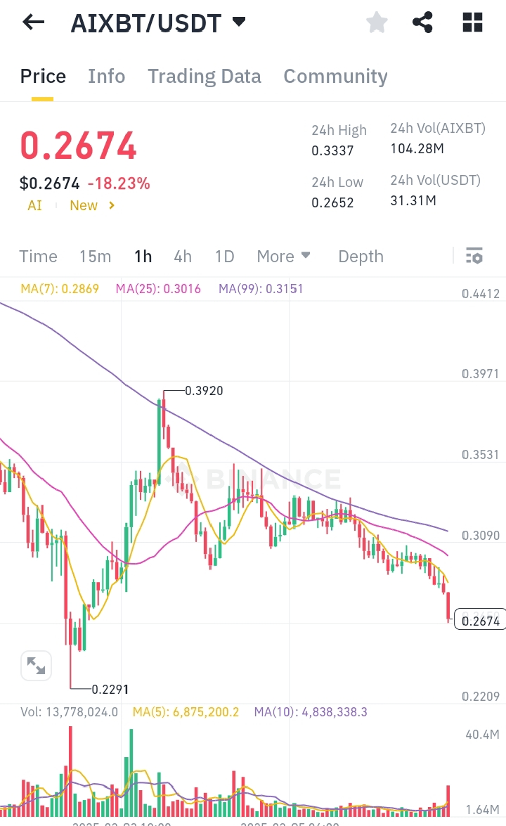 Le marché des crypto-monnaies a connu une volatilité importante, et AIXBT/USDT ne fait pas exception. Dans les derniers mouvements de prix, AIXBT a subi une baisse notable de 18,23 %, ramenant son prix à 0,2674 $. Cet article analysera les tendances du marché, les indicateurs clés et les mouvements futurs potentiels de cette paire de trading.