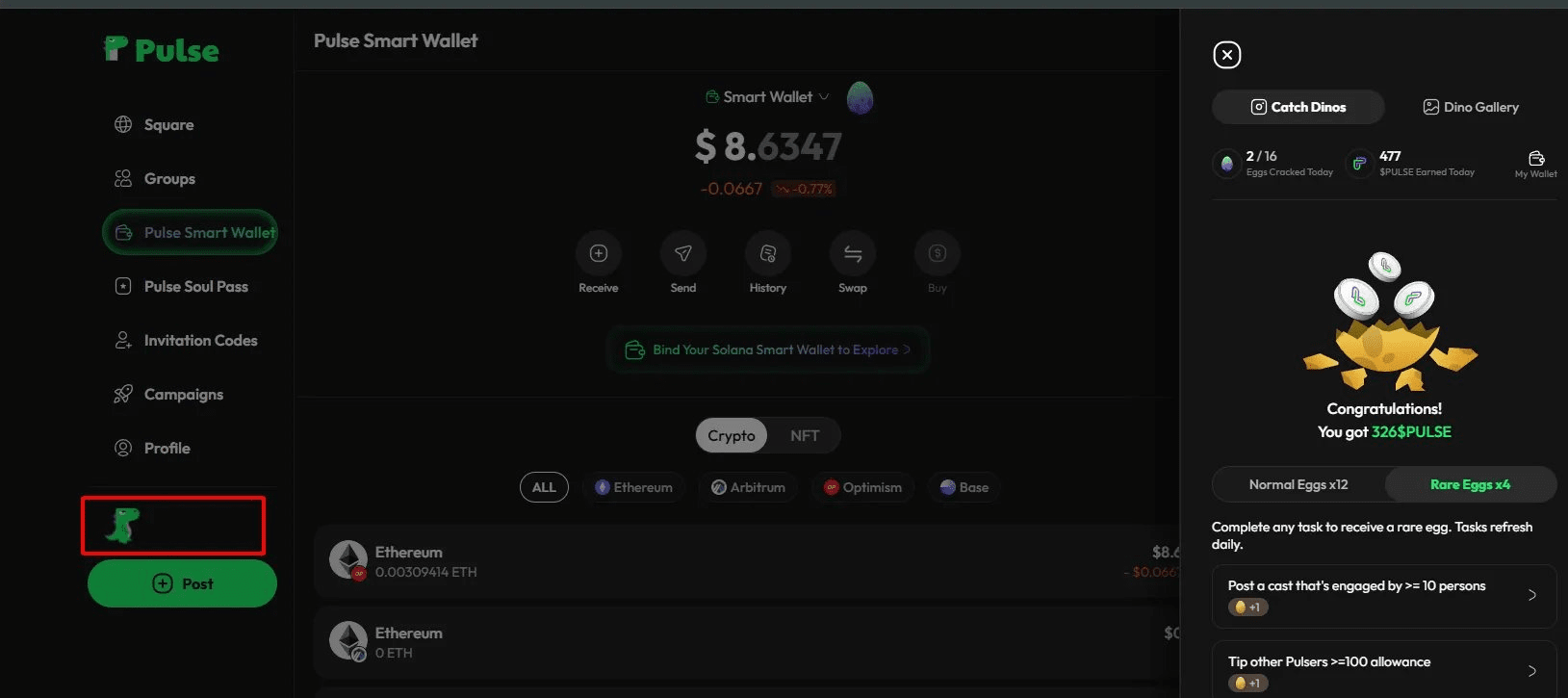 🔹 Compléter des tâches vous donne une chance de casser un œuf et de recevoir des jetons $PULSE supplémentaires. Selon votre chance, vous pourriez obtenir une grande quantité de $PULSE ou même faire éclore un DINO (NFT de dinosaure) ! 🦖