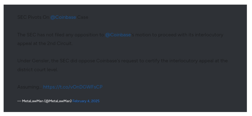 L'avocat pro-XRP James Murphy, connu sous le nom de MetaLawMan, a souligné un changement significatif dans le comportement de la SEC. L'agence a récemment décidé de ne pas s'opposer à la motion de Coinbase pour un appel interlocutoire, un mouvement surprenant étant donné la position inflexible précédente de la SEC sous la présidence de Gary Gensler.